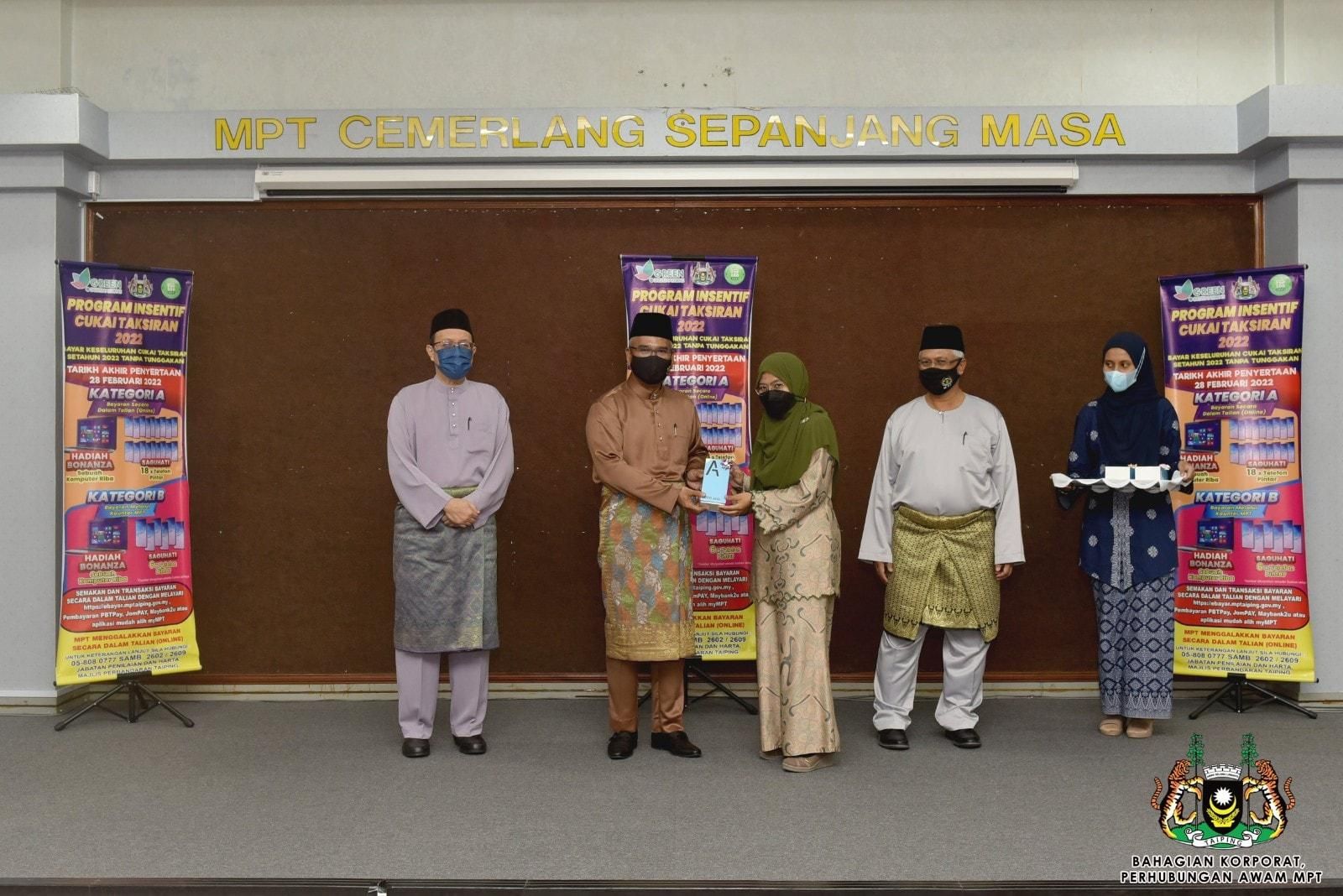 Tahniah diucapkan kepada para pemenang bagi kedua-dua kategori cabutan bertuah Program Insentif Cukai Taksiran 2022 Majlis Perbandaran Taiping. Terima kasih juga diucapkan kepada wargakota Taiping kerana telah menjadi warga yang prihatin dengan membayar Cukai Taksiran secara konsisten pada setiap tahun.